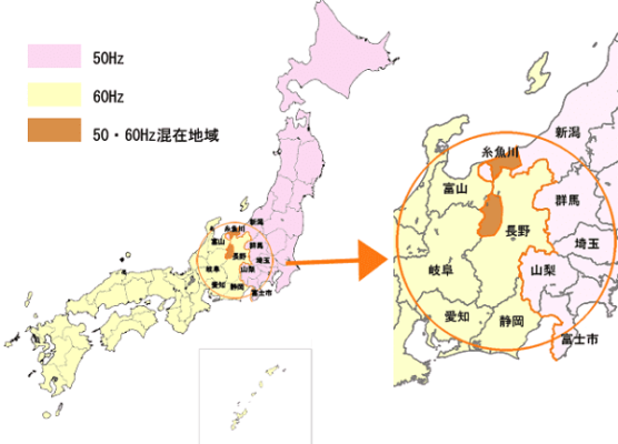 静岡県富士川と新潟県の糸魚川を境として東と西で電源周波数が変わります。