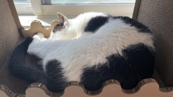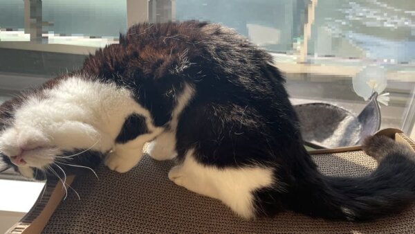 日がよく当たる場所で新品のキャットタワーにスリスリ……