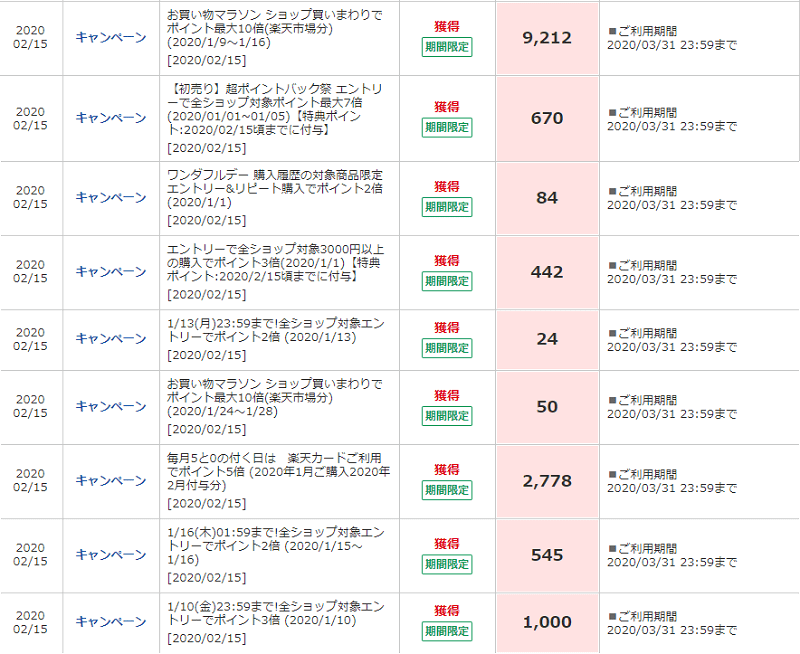 これは私がお買い物マラソンに獲得したポイント一覧です。
