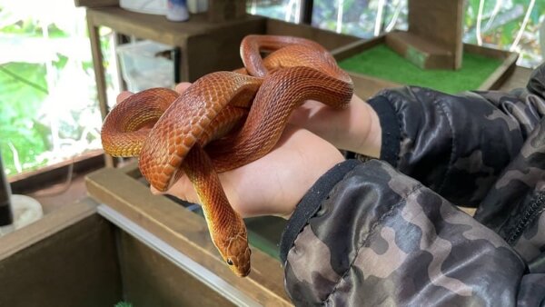 実はヘビは目があまりよくなく、耳もないから何かにくっついていると安心できると教えてもらいました。