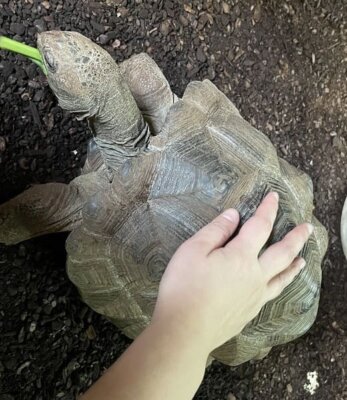 屋外でゾウガメに乗って記念撮影できる