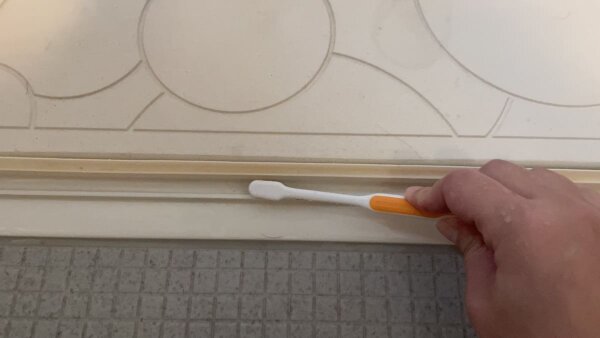 浴室ドアのサッシは使い古しの歯ブラシとお湯で軽く擦り洗い。