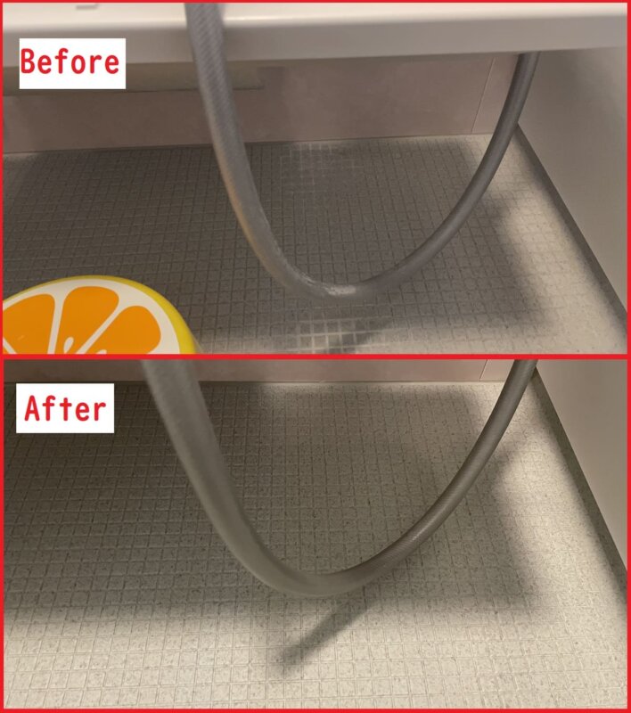 石鹸カスがこびりついていたホース、突き当りの床も白い汚れが見事に消失。