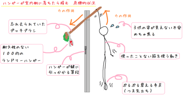 物干しハンガーに鍵の取手がひっかかり、無事脱出できました。