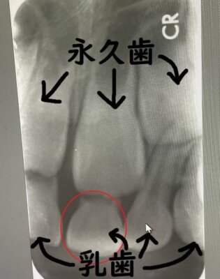 乳歯の根っこが吸収されて、永久歯がすぐそこまできているのがわかります。